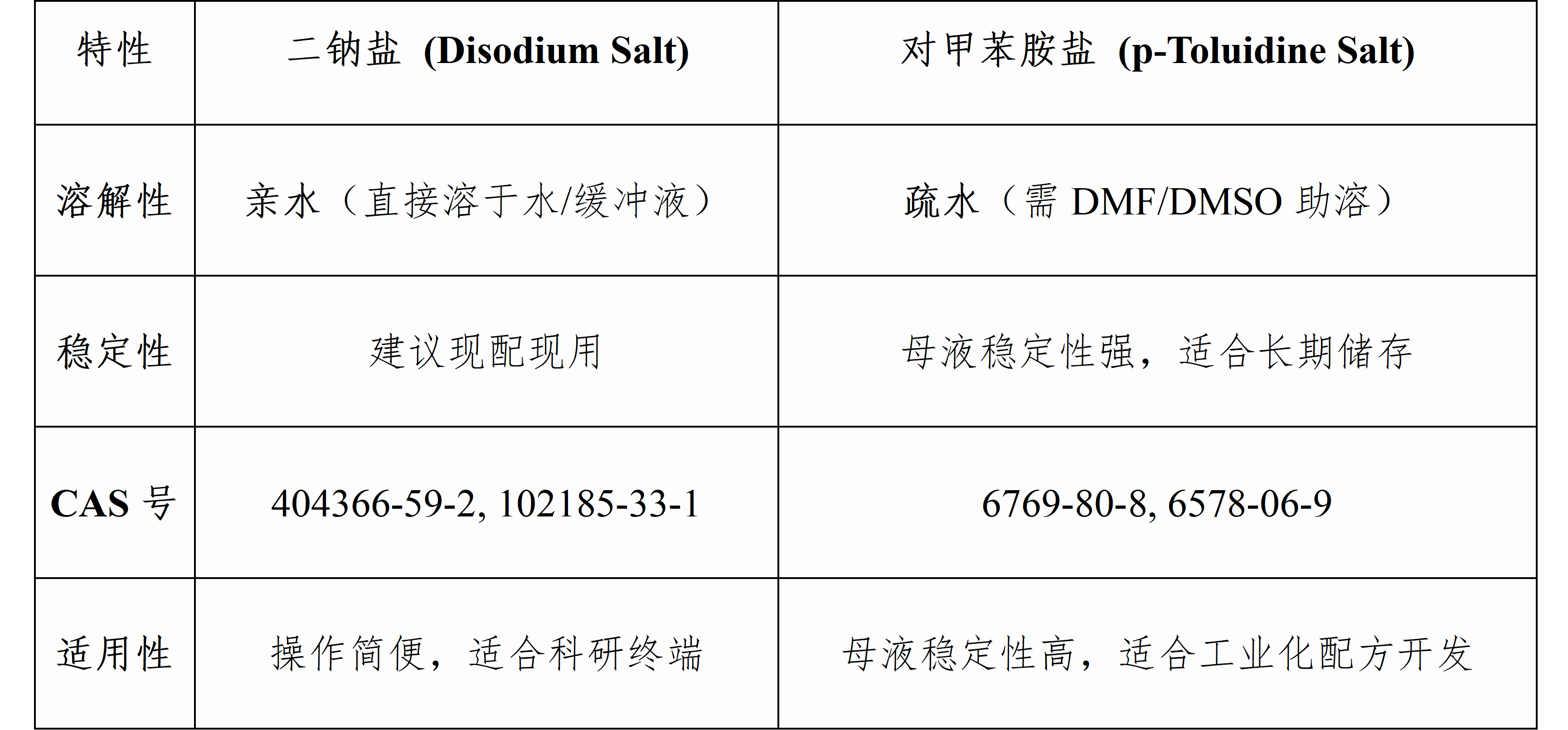 提供二钠盐(水溶性)与对甲苯胺盐(有机溶)两种形式,可灵活匹配从实验室研发配液到工业化试剂盒生产的不同工艺链路与稳定性需求。